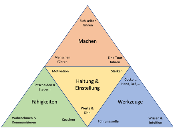 An der Spitze steht das konkrete Handeln: Touren planen und führen, Menschen anleiten und gleichzeitig die eigene Selbstführung meistern. Hier wird sichtbar, wie Rollenklarheit und Entscheidungen im Moment umgesetzt werden.