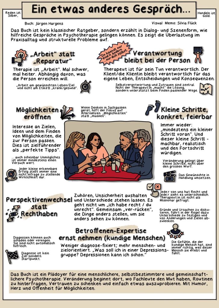 Mir ist beim Schreiben nachdrücklich deutlich geworden, dass Psychotherapie in der BRD (und andernorts) – „nur noch“ könnte ich zugespitzt einfügen – eine Unterabtei-lung der Medizin ist und damit notwendigerweise ihre Eigenständigkeit verliert. Doch darum dreht sich das Buch nicht. Es ist nur ein Aspekt, den die LeserIn „überlesen“ kann oder nicht, wie vieles andere auch. Genau deshalb kann ich nur sagen, dass Silvia Flück die „visualisierte Besprechung“ ganz großartig gemacht hat.